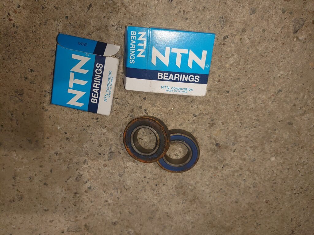 Vain noin 500 kilometriä keulahuollon jälkeen etupyörän laakeri alkoi oireilla. Pientä rohinaa ja välystä – ei muuta kuin pyörä pukille ja osat esiin. Kyseessä on Kawasaki GTR 1400 (Concours 14), ja laakereina käytin NTN:n laakereita.